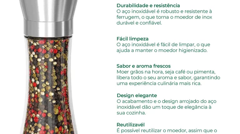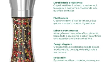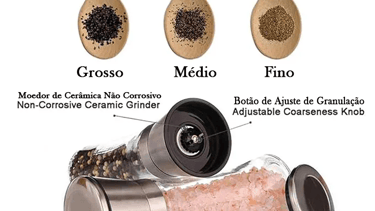 Moedores premium em vidro e inox que preservam a intensidade das especiarias até o momento do toque final. Design elegante para cozinhar e servir com estilo.